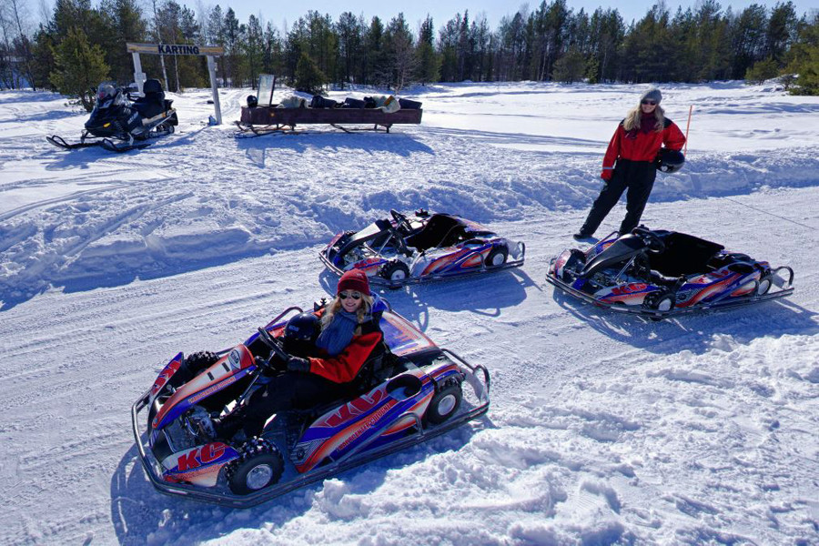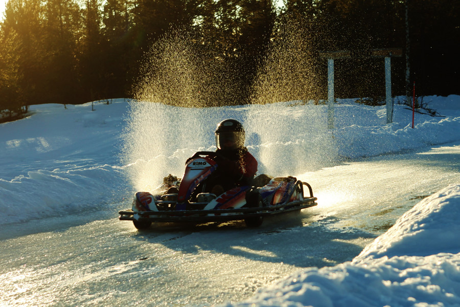 Our karting track is situated just near Hotel Ivalo. We will walk to other side of the river where the track is situated. Ice karting is fun and suits everyone. There are no exact age limits but the driver must be tall enough (approx. 150 cm) to reach the pedals.